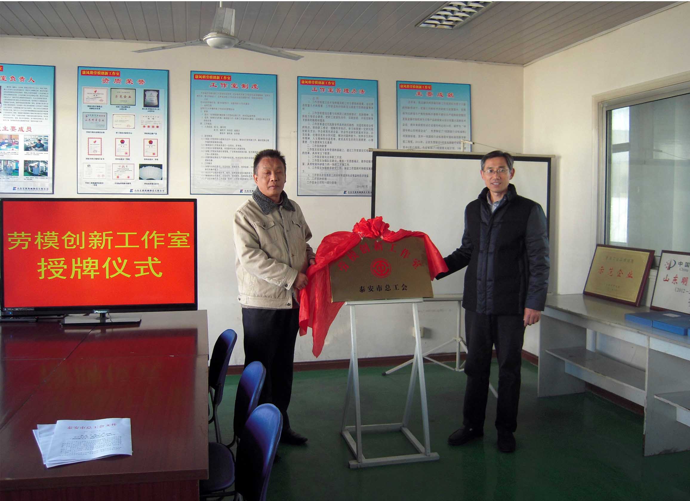 根據(jù)泰會(2014)50號《泰安市總工會關(guān)于命名第二批泰安市“勞模(高技能人才)創(chuàng)新工作室”的決定》文件精神,“康鳳明勞模創(chuàng)新工作室”被命名為第二批泰安市“勞模創(chuàng)新工作室”,這是繼今年5月份“康鳳明勞模創(chuàng)新工作室”被岱岳區(qū)總工會首批命名后取得的又一殊榮。12月5日,市總工會生產(chǎn)保護(hù)部部長劉軍、岱岳區(qū)總工會常務(wù)副主席李福江等市區(qū)部門領(lǐng)導(dǎo)來集團(tuán)公司舉行了揭牌、授牌、掛牌儀式。副總經(jīng)理、工會主席聶化濤等領(lǐng)導(dǎo)參加了活動儀式。